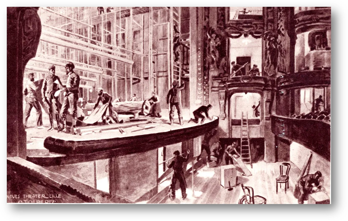 La Gazette de Francfort a publié un article sur l’inauguration du théâtre de Lille. Il dit que les Allemands en ont terminé la construction avec les plans. Ce beau théâtre en pierre blanche fait un effet singulier entre la Bourse et les ruines du quartier de la Gare. A l’inauguration la salle était très belle, illuminée et décorée d’un bel arbre de Noël. Dans la loge principale, ce n’était pas M. Poincaré, ou le Ministre des Beaux Arts qui présidait mais le Kronprinz de Bavière. A quelques kilomètres de là, le canon anglais crachait la mort et pendant ce temps, sur la scène, se manifestait le génie de la poésie allemande. On avait fait venir une troupe d’artistes du Hanovre.
