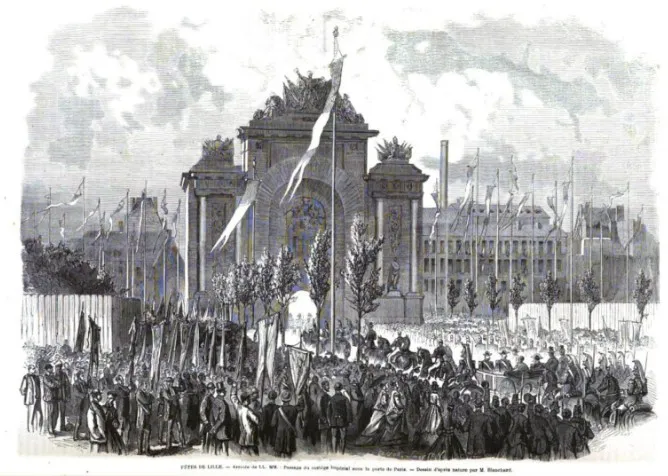 Partout les fenêtres, les balcons, les corniches et les moindres saillies des toitures, sont garnis de grappes de têtes curieuses, enthousiastes et frémissantes d'impatience. Malheureusement, le ciel resplendissant toute la matinée, se couvre de nuages; de larges gouttes de pluie dénotent un orage qui approche. Enfin, à cinq heures, le canon se fait entendre, les cloches sonnent à toute volée et annoncent l'arrivée du train impérial. Leurs Majestés entre dans Lille et se rendent à l'église Saint-Maurice, où elles sont reçues par Mgr l'archevêque de Cambrai. Un rayon de soleil qui parait entre deux ondées, éclaire le cortège au moment où il passe sous la porte de Paris, et j'en profite pour terminer à la hâte le dessin que je vous envoie. A la sortie de l'église, après le Te Deum, la pluie redouble d'intensité; on presse Leurs Majestés de ne pas continuer leur marche en voiture découverte; l'Impératrice s'y refuse, et c'est en légère robe blanche, sans même recourir au faible abri de son ombrelle, qu'elle se tient à côté de l'Empereur pendant le parcours de l'église à la Préfecture.