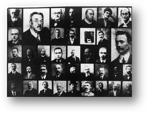 Parmi ces photographies, pour les deux premières rangées (du haut en bas et de gauche à droite), on trouverait : Louis Guérin, Edmond Labbé, Paul Delporte, Paul Collinet, Valentine Labbé, Mme Colinet, Mme Zeller ; Jean Pratte, Louis Collier, Jules Langlois, Jean Ogilvie, Paul Ladreyt, André Pratte. Tous les portraits n'ont pu être identifiés, d'autant que les quelques noms notés par André Pratte au dos de ce document révèle des inexactitudes.
