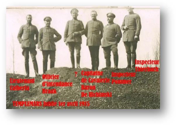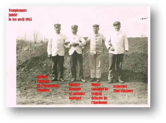 A Templemars, les occupants qui se sont attribué les plus belles maisons de l’actuelle rue Jules Guesde organisent un anniversaire le 1er avril 1915. A cet effet, ils font venir sur place trois cuisiniers et un pâtissier détachés de leurs unités qui étaient à proximité. Afin de se souvenir de l’évènement mémorable, ils font une photo du personnel de cuisine. Les convives ont tous rang d’officier, bien souvent issus de la cavalerie. Tout le monde n’avait pas accès aux boitiers photographique. Encore une fois, il s’agissait d’un évènement exceptionnel auquel tout le monde n’était pas invité.