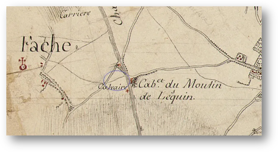 Cette conclusion est d'ailleurs très bien mise en évidence par le plan des Frontières du Nord de 1773 conservé aux SHD de Vincennes [GR 6 J 10 C 652], qui présente par un petit tracé succinct la présence d'un petit sentier reliant bien le Pavé du Moulin de Lesquin au sentier redescendant vers le centre de Faches :