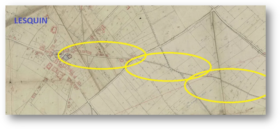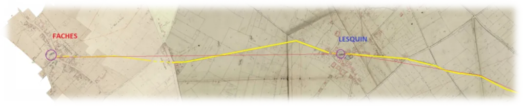 Mais en vision globale, nous sommes bien en présence d'une très ancienne voie droite, servant à relier des points géographiques précis à travers nos contrées. Son origine reste néanmoins floue - prétendre qu'il s'agit d'un lointain héritage gallo-romain serait légèrement présomptueux en l'absence de preuves formelles -, des études plus approfondies sur l'historique des terres voisines nous permettront, dans un avenir que j'espère proche, de déterminer avec plus d'exactitude l'ancienneté de cette voie et son utilité primaire. Nous pourrions également en déduire que la présence même des églises de Faches et Lesquin, placées sur ce fameux axe, n'a rien non plus d'un hasard, mais résulterait bien de la volonté d'une civilisation d'implanter leurs jalons à des endroits bien définis, et que de là se seraient par la suite développés des groupements de populations humaines, créant nos actuels bourgs.