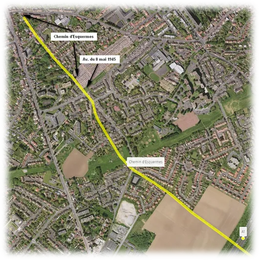 Si aujourd'hui, ce chemin n'est quasiment plus visible côté Lesquin, en raison de l'A1 qui le coupe et du Pont de la rue Delory formant une butte à leur croisement, côté Ronchin en revanche, une partie de ce chemin est encore perceptible à travers les champs, puis une partie reprise par l'avenue du 8 mai 1945 avant de reprendre son véritable nom de « chemin d'Esquermes », longeant l'arrière du cimetière actuel de Ronchin et débouchant curieusement sur la rue Charles Saint-Venant.