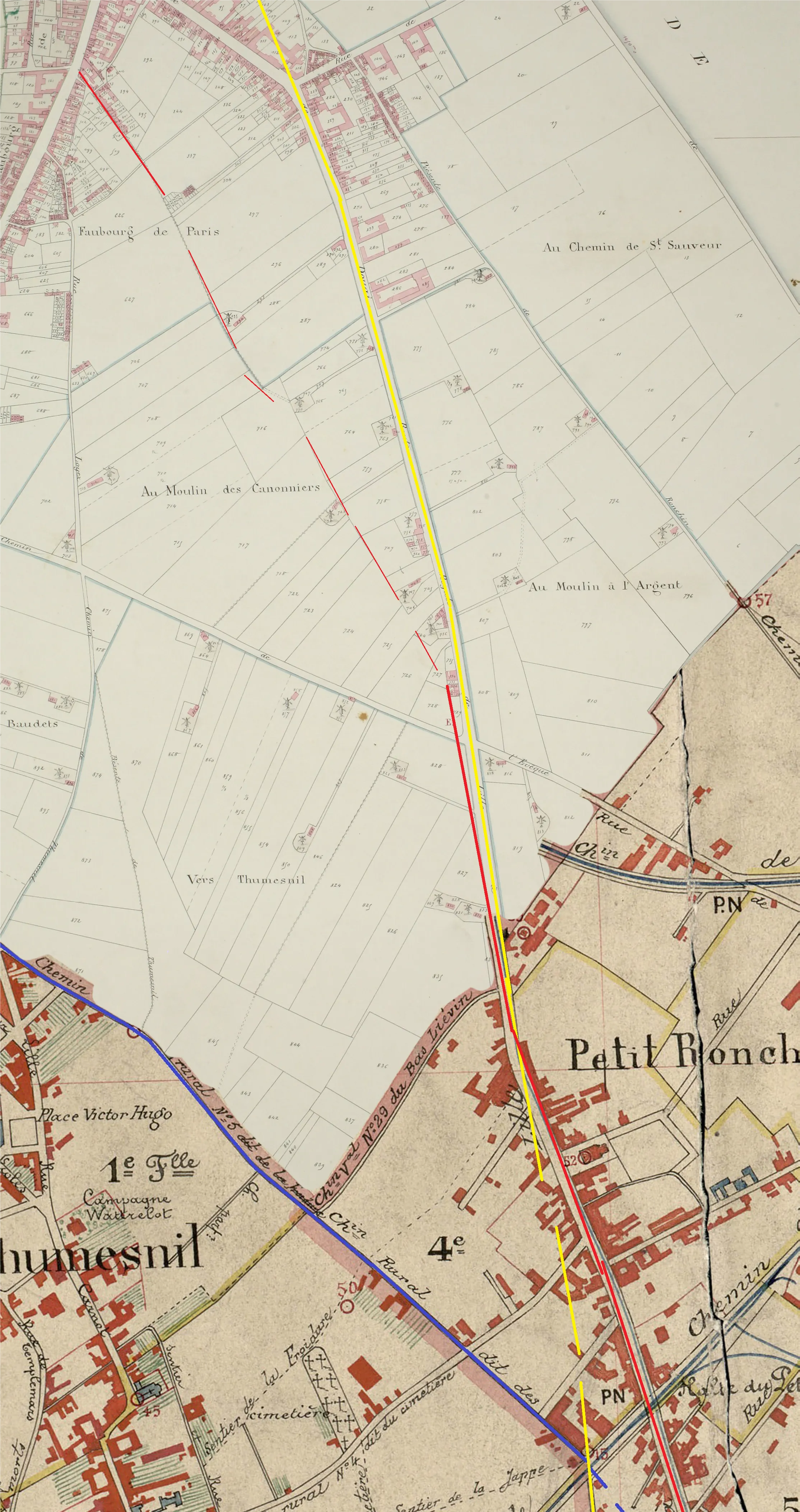 En poursuivant vers le nord, d'une ligne imaginaire (en rouge) notre grande route, nous croisons une ligne droite formée par certaines limites parcellaires au niveau du croisement route de Douai / chemin de l'Evêque, et cette même ligne semble être le prolongement d'un chemin davantage dessiné un peu plus au nord, qui aboutit à la vieille rue d'Arras... et justement, ce « chemin davantage dessiné » ainsi que la petite déviation en pointillés que nous apercevons, correspondent aujourd'hui à la rue de Fontenoy passant devant l'Université de Droit de Lille 2 et sur la place Fernig de la Porte de Douai !