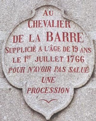 "Dès 1774, Voltaire tentera d'obtenir la réhabilitation du Chevalier. Mais il vit en Suisse. En 1789 ce sera la noblesse de Paris qui demandera la réhabilitation. Ce sera chose faite en novembre 1791. L'histoire du Chevalier de La Barre a fourni à Fabre d'Eglantine le sujet de sa tragédie d'Augusta, jouée en octobre 1787. Marsollier fit représenter sur le théâtre des Italiens un drame en un acte intitulé le chevalier de La Barre le 8 juillet 1791.