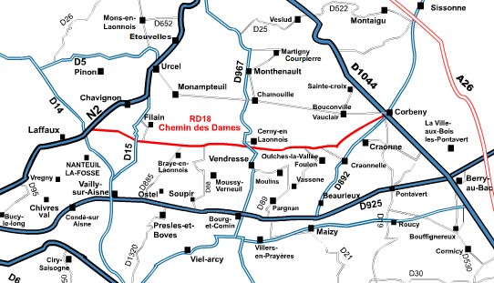Carte du Chemin des Dames (en rouge, de la N2 à la D1044)