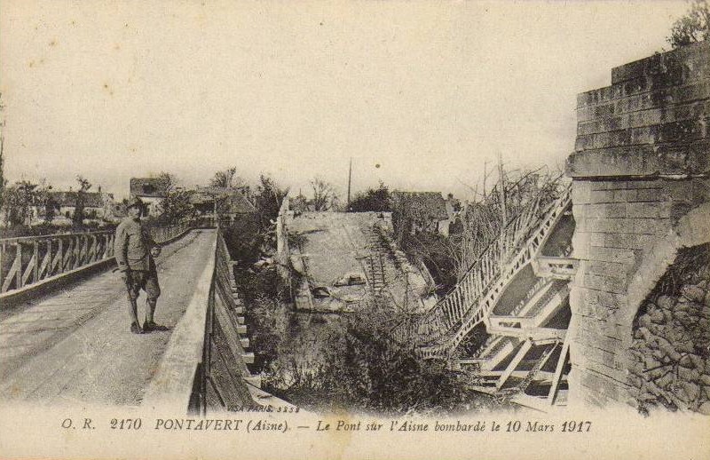 Pontavert (Aisne) Le Pont sur l'Aisne bombardé le 10 mars 1917 (un an plus tôt)