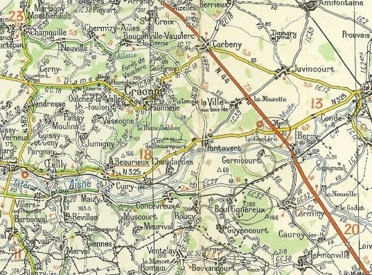 Jusqu’au 12 juin la vie se passa péniblement, la nuit nous ne dormions plus tranquillement ; aussitôt que l’on entendait les bourdonnements d’aéros, chacun se cachait du mieux qu’il pouvait, c’était la panique. Le lendemain un camp de munitions éclata de l’autre côté de la ligne, aux environs de Pontavert.