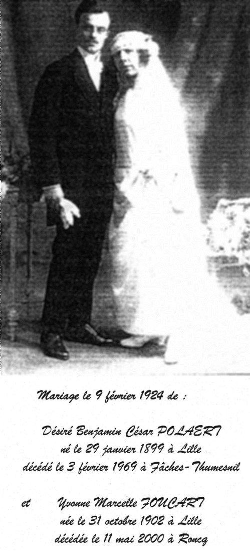 Désiré Polaert épousera Yvonne Foucart le 9 février 1924. Il décédera à Faches-Thumesnil le 3 février 1969, son épouse le rejoindra le 11 mai 2000.