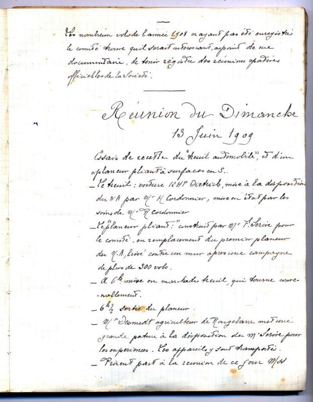 La page suivante du cahier d'expérience nous apprend que 10 personnes ont assisté à cette réunion qui s’est passée par un temps maussade. Deux vols furent réalisés à des altitudes modestes, de 0,50 à 2,50 m.