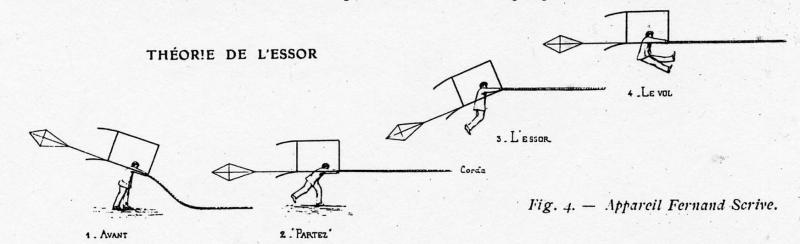« M. Scrive nous a expliqué ce qu’il appelle la théorie de l’essor. Pour prendre son essor, l’élève aviateur tient l’appareil au-dessus de lui, les deux traverses longitudinales du châssis étant engagées sous ses aisselles : la présence du stabilisateur l’oblige à pencher le corps en avant, comme l’indique notre schéma (fig. 4). Le treuil, mis en marche, tire sur la corde, attachée à l’avant de l’appareil ; la course commence : c’est le deuxième acte. Au bout de quelques mètres la vitesse d’enlèvement est obtenue (8 à 9 mètres à la seconde) : on donne alors l’incidence au planeur et celui-ci s’enlève, l’expérimentateur ayant soin de se tenir les pieds en arrière. On ramène ensuite le centre de gravité vers l’avant en portant les jambes dans la même direction et le vol devient horizontal. La descente s’opère à l’arrêt du treuil ; le planeur, bien manœuvré, descend alors tranquillement sur le sol. Vous voyez que c’est très simple.