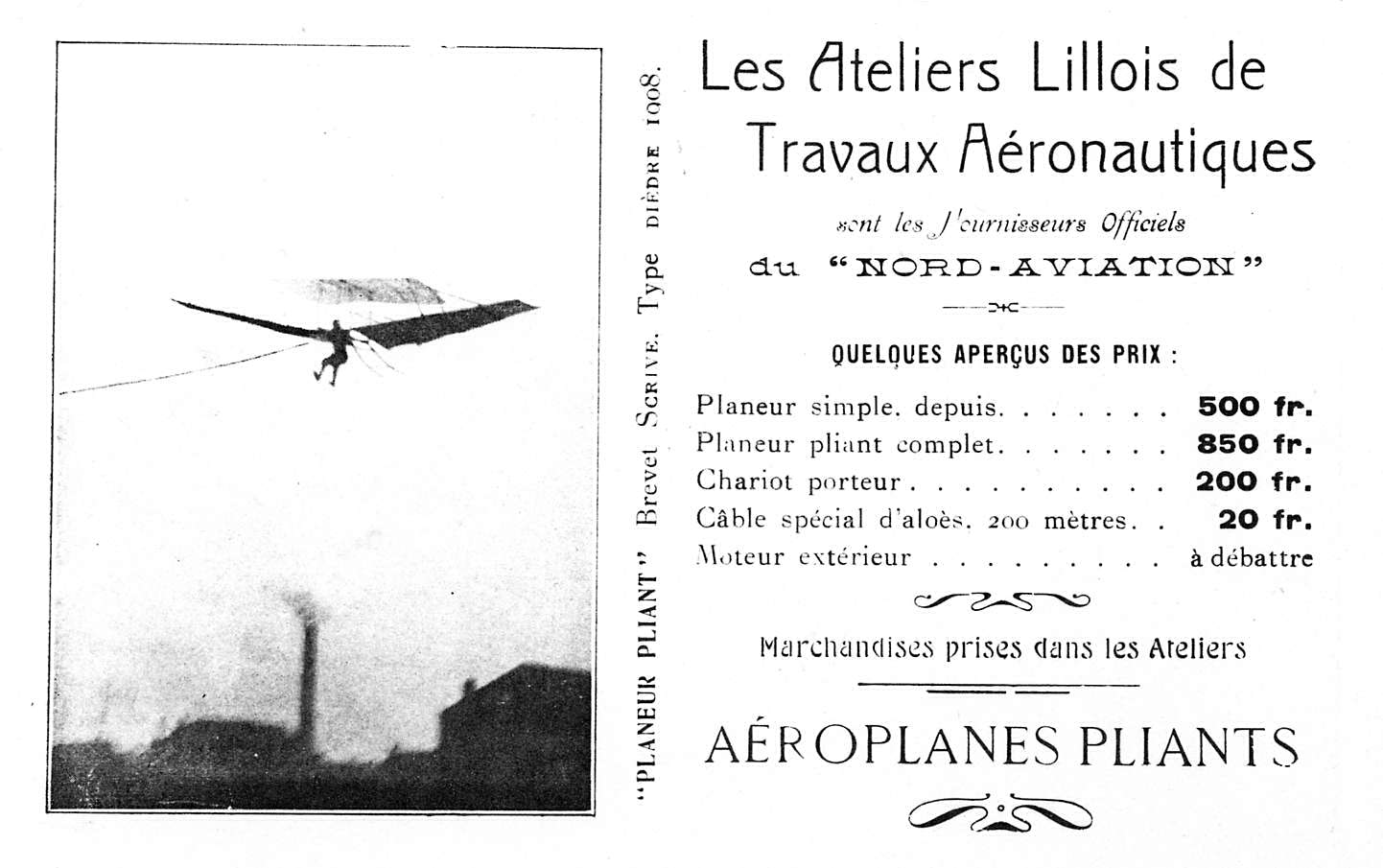 Puisque nous venons de parler d’argent, la carte de visite commerciale nous donne le tarif des planeurs, du chariot, de la corde d’aloès de 200 mètres de longueur (le terme est facultatif, je pense).