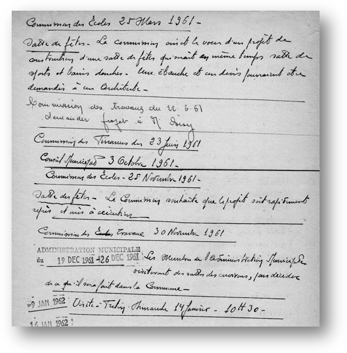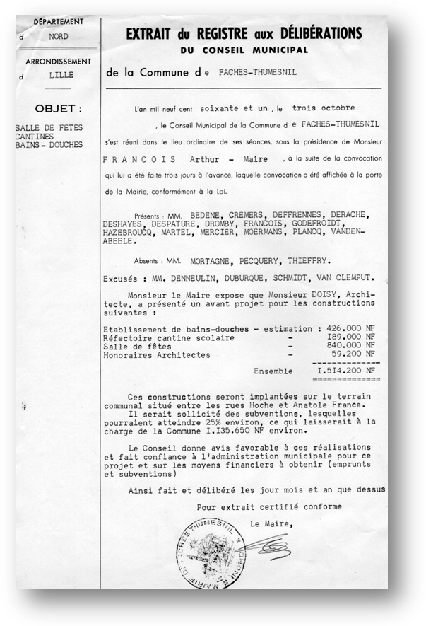 L’an 1961, le 3 octobre, Monsieur Arthur François, Maire, expose, lors d’une séance du Conseil municipal, que Monsieur Doisy, architecte, a présenté un avant projet pour diverses constructions au sein de la commune : établissement de bains douches (estimation 426.000 NF), réfectoire cantine scolaire (189.000 NF), salle de fêtes (840.000 NF). Les honoraires des architectes se montent à 59.200 NF. Il est précisé que ces constructions seront implantées sur le terrain communal situé entre les rues Hoche et Anatole France, qu’il sera sollicité des subventions qui pourraient atteindre 25% environ, ce qui laisserait à la charge de la commune 1.135.650 NF environ. Le Conseil donne avis favorable à ces réalisations et fait confiance à l’administration municipale pour ce projet et sur les moyens financiers à obtenir, emprunts et subventions.