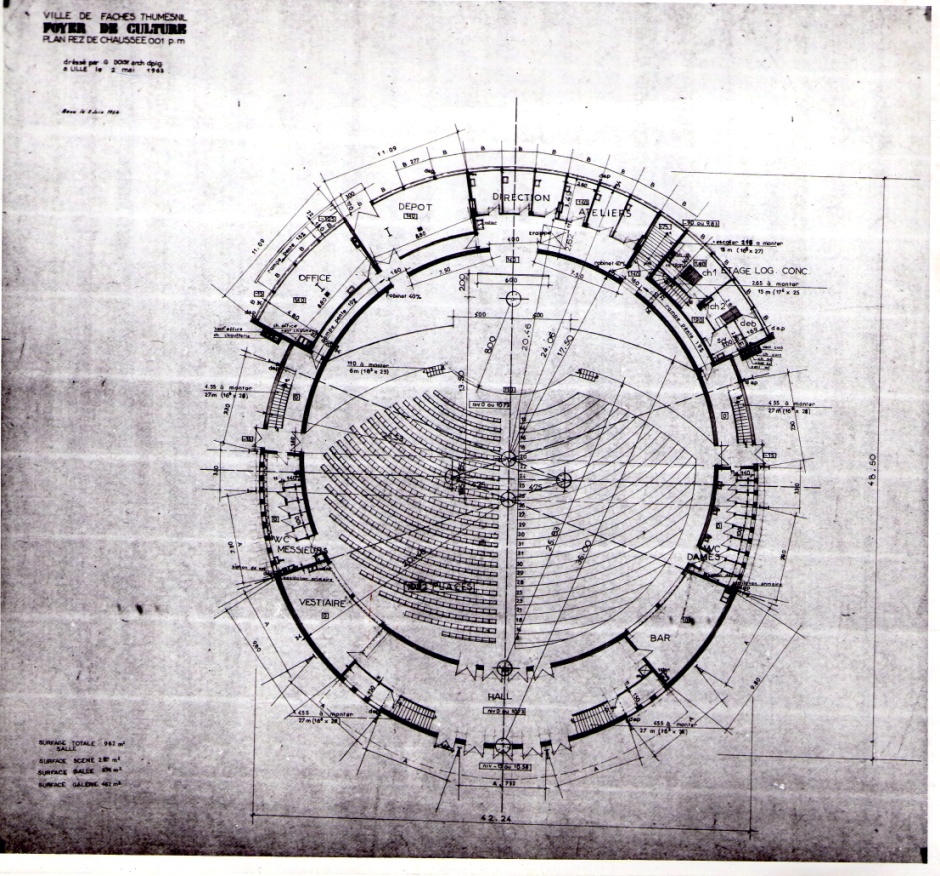 Plan réalisé par M Doisy en date du 2 mai 1963. L’implantation de certaines zones, notamment le bar et les WC sera modifiée suite au rapport du Conseil général des Bâtiments de France l’année suivante.