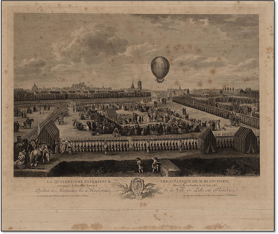 On ne peut décrire, disent les Feuilles de Flandre, l’effet magnifique et imposant de cette ascension. Qu’on se représente un superbe ovale de quatre vingt seize pieds de hauteur sur trente cinq de diamètre, auquel étoit suspendue une belle nacelle ornée de crépines d’or, M. Blanchard et le chevalier de L’Espinard, son compagnon de voyage, saluant de leurs drapeaux, les applaudissements de ceux que la sensibilité, l’effroi ou l’admiration ne rendoient pas immobiles ; toutes les troupes de la garnison (six régiments) sous les armes, en grande tenue, formant un grand quarré qui renfermoit le tout, cent tambours battant aux champs et plus de deux cens musiciens ou trompettes sonnant fanfare, tout concouroit à rendre ce moment ravissant. Les remparts étoient couverts de monde et les promenades, les maisons, les fenêtres, les toits, les clochers regorgeoient de spectateurs."