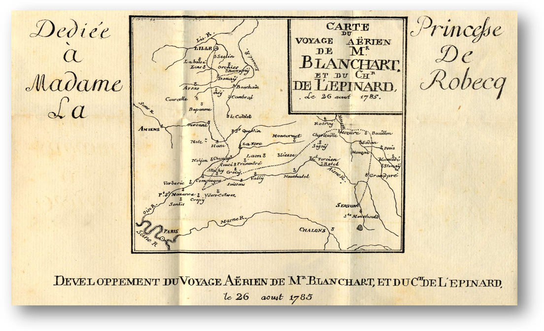 Et le vol de Jean Pierre Blanchard va se poursuivre sur une distance approximative de 380 kilomètres, survolant, comme vous pouvez le voir sur la carte illustrant cet article, le Nord, le Pas de Calais, la Somme, l’Oise, l’Aisne, les Ardennes pour enfin se poser à Servon dans la Marne. Bel exploit me direz-vous. 380 kilomètres en sept heures, soit une moyenne d’environ 55 km/h. Pour cette époque là, connaissez-vous un moyen de locomotion capable de tenir le 55 km/h durant sept heures ? Même un cheval n’aurait pu le faire. Le 26 août 1785, on a frôlé le record de vitesse …