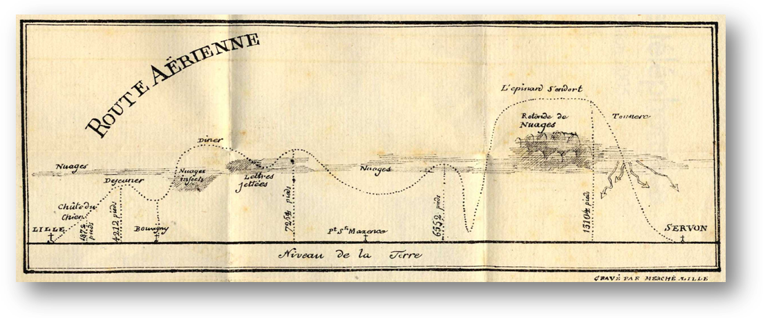 "Arrivés au dessus de la Salpêtrière (à la sortie de la place de Béthune), près de la porte Notre-Dame, ils laissèrent tomber le parachute qu’ils avoient emporté avec eux. Il descendit avec une telle lenteur que le vent le poussant dans la direction du ballon, il ne prit terre qu’à une lieue de Lille, entre l’église de Faches et le moulin de l’Arbrisseau. Un particulier de la ville, l’ayant suivi constamment, est arrivé dans le moment où un laboureur et quelques autres paysans le relevoient. Il le reporta en ville ainsi que le chien enfermé dans les cerceaux. Le même chien avoit servi pour les expériences des 19 et 21 et n’a éprouvé aucun accident. Quant à l’aérostat, on le suivit des yeux pendant quelques temps. On le vit entrer dans un nuage à 11 heures et 58 minutes …. "