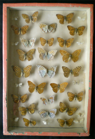 Et puis il y a les papillons. Une grande boîte en bois, très lourde, avec un couvercle en verre pour pouvoir regarder les papillons dedans la boîte. "N’ouvre jamais cette boîte ! Tu pourrais abîmer les papillons. Regarde avec tes yeux !" C’est dur parce que tu as vraiment envie de les toucher. Surtout les gros. Il y en a un qui a des poils de toutes les couleurs. On dirait de l’essence dans une flaque d’eau. Comme sur les tartines trempées dans le lait, que mon père laisse moisir sur de la terre, pour faire venir des petits vers qu’il donne à ses poissons. Ceux dans l’aquarium à la maison, pas dans le bassin. A un moment, la tartine elle est pleine de poils. Surement que çà chatouille si on la touche…