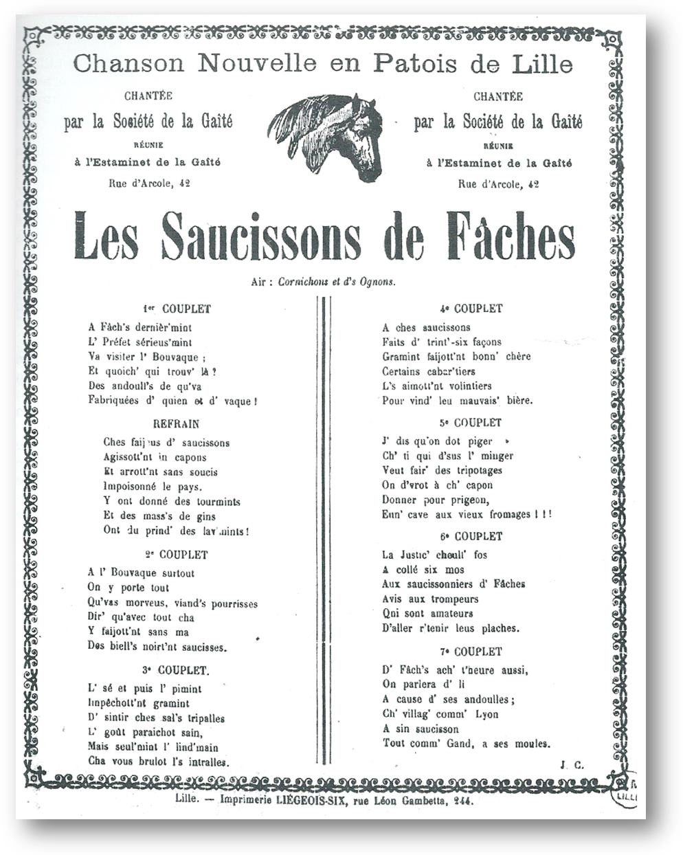 Nous vous laissons à présent lire le texte de la chanson qui parut pour les fêtes et le cortège du mardi gras de 1888 à Wazemmes et qui fût certainement accueillie en connaissance de cause par les faches-thumesnilois.