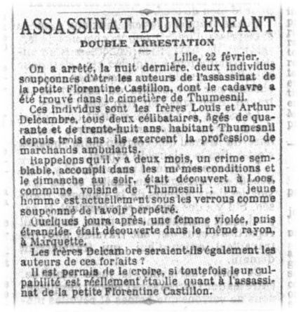 "On a arrêté deux individus soupçonnés d’être les auteurs du crime de Thumesnil, les frères Delcambre, âgés de trente-huit et de quarante ans, marchands ambulants, voisins de l’enfant assassiné lundi. Ils ont lavé des chemises, alors que d’ordinaire ils donnent leur linge à une blanchisserie du voisinage. Le Parquet vient de se transporter à Thumesnil pour visiter leur logement."