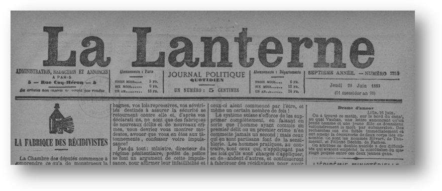 "On a trouvé ce matin, sur le bord du canal, au quai Vauban , une lettre annonçant qu’un jeune homme et une jeune fille se donnaient volontairement la mort par submersion. Des recherches ont été faites immédiatement et ont amené la découverte de deux corps liés ensemble. Ce sont les nommés Blivart, de Thumesnil, et Félicité Déchin, de Faches.