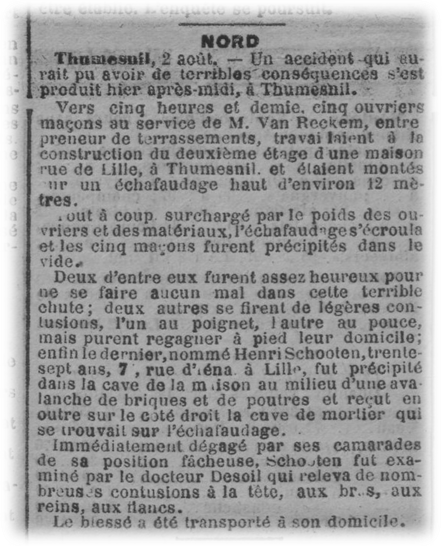 "Un accident qui aurait pu avoir de terribles conséquences s’est produit hier après-midi, à Thumesnil. Vers cinq heures et demie, cinq ouvriers maçons au service de M. Van Reckem, entrepreneur de terrassements, travaillaient à la construction du deuxième étage d’une maison rue de Lille , à Thumesnil, et étaient montés sur un échafaudage haut d’environ 12 mètres. Tout à coup, surchargé par le poids des ouvriers et des matériaux, l’échafaudage s’écroula et les cinq maçons furent précipités dans le vide.
