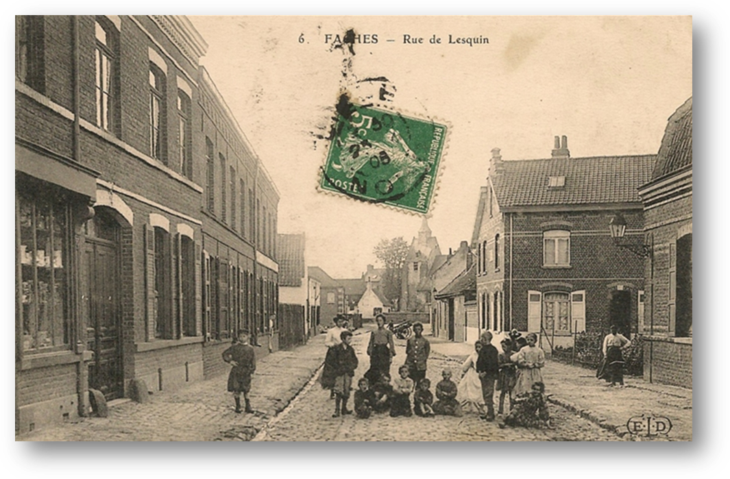 Cette carte postale éditée par ELD, oblitérée en 1908 est très intéressante. Elle nous montre la rue de Lesquin à Faches au tout début du siècle dernier. Les enfants posent avec facilité pour l’animation, nullement gênés par la circulation. Remarquez l’église Sainte-Marguerite, avec son clocheton, dans le lointain. Appelée à l’origine Chemin de Faches à Ronchin puis rue de Lesquin, la voie fut baptisée du nom d’Henri Barbusse par délibération du Conseil municipal du 25 août 1937 à la suite d’une demande du Comité antifasciste de Faches souhaitant rendre hommage à cet homme pacifiste. La fête d’inauguration se déroula le 15 mai 1938.
