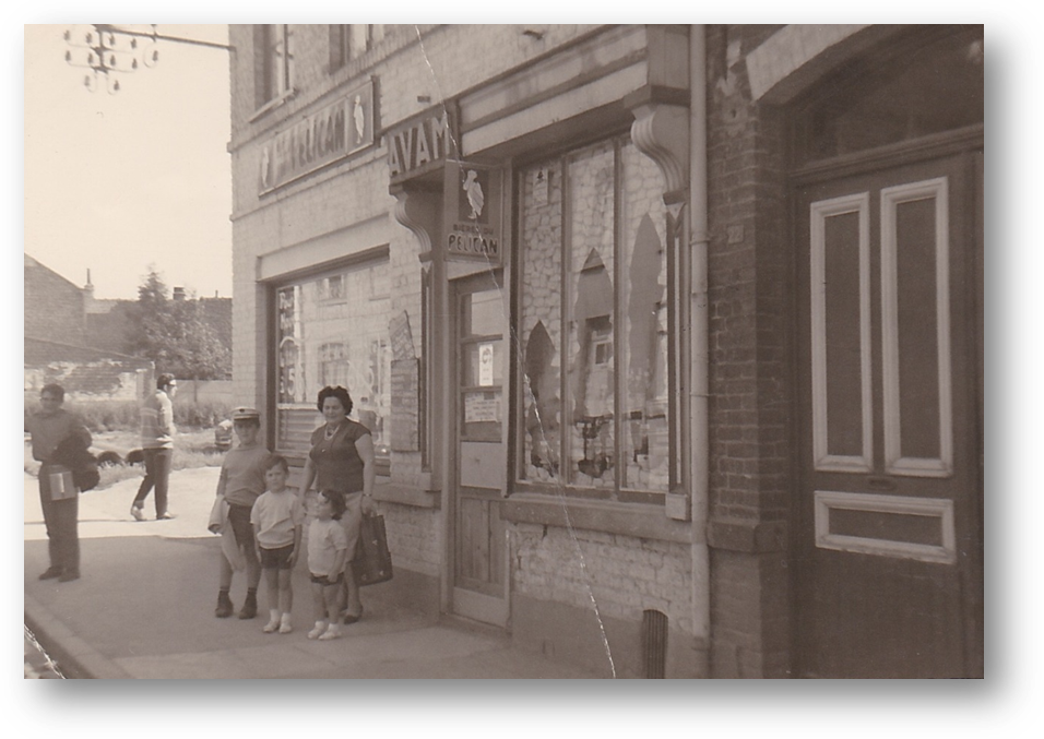 Dernier document, la photographie que nous a fait parvenir récemment Monsieur Olivier Foulont. Elle est prise en sens inverse. Sur la droite la porte cochère puis l’épicerie Avam. La photographie date de 1965, époque de l’achat, et Monsieur Foulont père immortalise son magasin qui dans quelque temps deviendra une épicerie Spar. Son épouse et ses trois enfants, dont Olivier, posent fièrement. Ils tiendront ce commerce jusqu’en 1972.