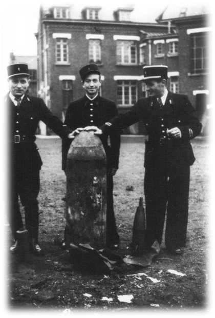 A droite, bombardement de la nuit du 10 au 11 mai 1944. La bombe anglaise tombée sur le café Carré, 37 rue Ferrer. Elle n’a heureusement pas explosé et a été ramenée dans la cour de la Mairie. De gauche à droite le lieutenant Chaval, X et le capitaine Pennel. Ce dernier va la désamorcer au burin, la poudre aurait servi la Résistance locale pour un attentat en Belgique.