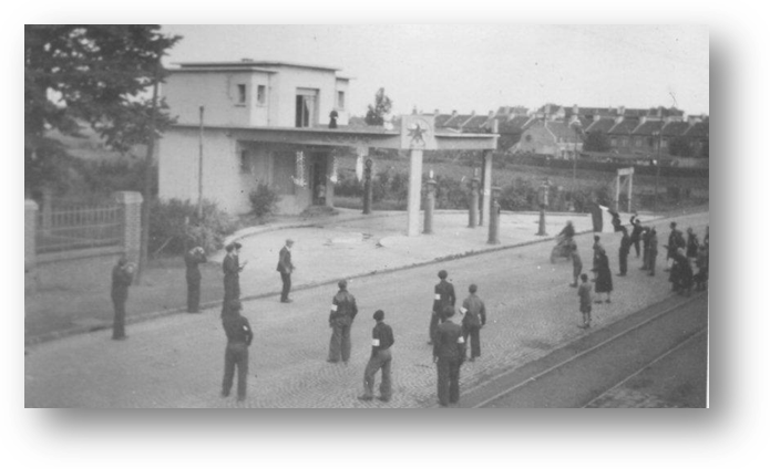 Rue du faubourg d'Arras, au niveau de la station essence Azur, les résistants et la population dans l'attente - l'emplacement fut plus tard occupé par la station essence Total."