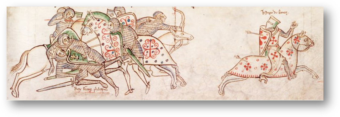 Bataille de Bouvines. Philippe de France désarçonné. Hugo de Boues galope à droite, tiré à l'arc.