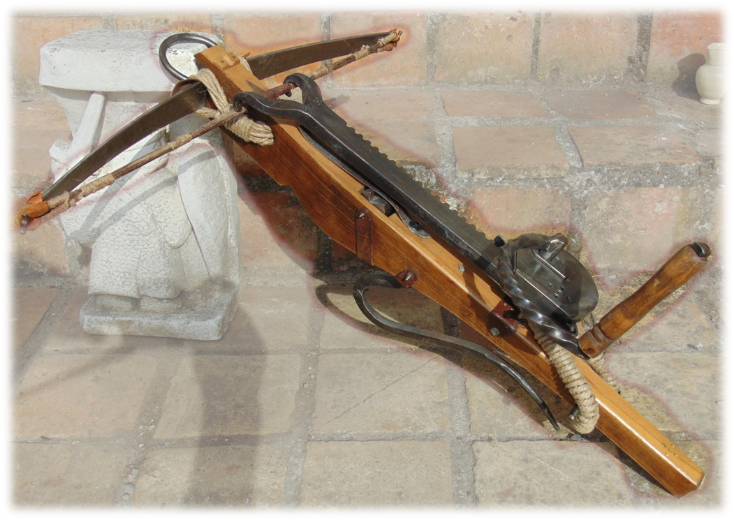 Cette arme était utilisée à la chasse. La corde était tendue à l’aide d’un cric, le crenequin. Au moment du tir l’arbalétrier n’a pas à fournir l’effort de l’archer. Il peut se consacrer entièrement à sa visée. La puissance est comparable à celle d’un fusil pour le gros gibier. A l’époque, un carreau d’arbalète pouvait perforer une armure, ce qui était impossible avec un arc.