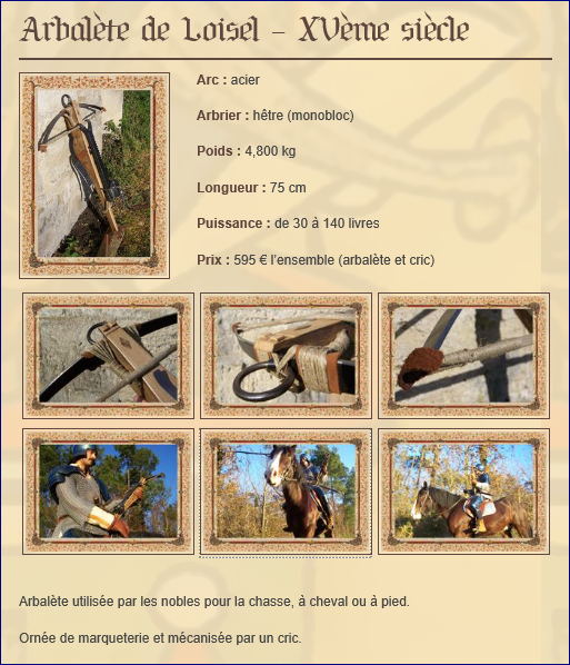 Au cours de mes recherches, j’ai découvert qu’il existait une arbalète de Loisel au 15°siècle. Avec l’aimable contribution de Monsieur Serge Adrover des établissements L’Arbalestrie, il m’est possible de vous en présenter un exemplaire fabriqué à l’intention des amateurs de reconstitution historique.