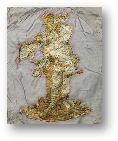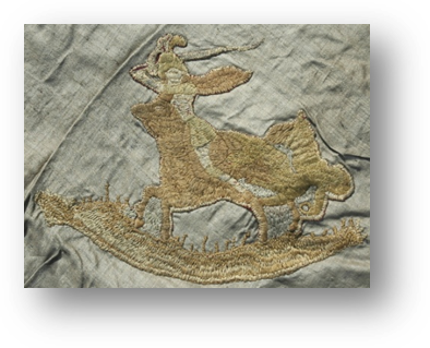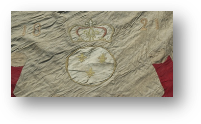 Le drapeau est illustré par des broderies mieux conservées que la toile de fond. Au centre, le glorieux Saint Sébastien comme disaient les archers à l’époque. Il a survécu à son supplice, des soldats mauritaniens, habiles à l’arc avaient pour mission de la mettre à mort à coups de flèches. Ils l’estimaient et ils ont tiré avec soin pour ne toucher aucun organe vital. Dans le quart supérieur l’indication Thumesnil Pse (Paroisse) Faches. La date 1821 et la couronne et les trois fleurs de Lys de la Restauration. A Thumesnil, il y a une société d’archers au cabaret tenu par Armand Lepot en 1819, nous avons probablement affaire à son drapeau. Dans les quarts latéraux des archers vêtus à l’antique. Dans le bas une, allégorie curieuse, un cavalier attaqué par un fauve.