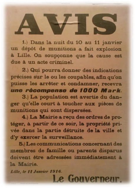 Les Allemands cherchent un coupable. Ils ont mis aujourd’hui une affiche. Ils soupçonnent un acte criminel et promettent une récompense de 1000 Marks à ceux qui pourraient permettre de l’élucider.