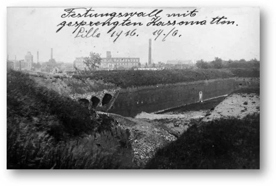 Dans le dépôt il y avait des boulets vides. On les charge à l’arsenal près de la porte de Béthune, d’où ils partent au feu. Il y avait dans la casemate qui est sous les remparts, à côté du dépôt, toute leur provision de poudre : 600.000 kg. On venait d’y entrer une cinquantaine de wagons. C’est cette poudrière qui a sauté. L’entrée est dans un monument de maçonnerie qui est inséré dans les remparts comme une porte de la ville, mais fermée. On l’appelait les « 18 Ponts » à cause du nombre d’arches.