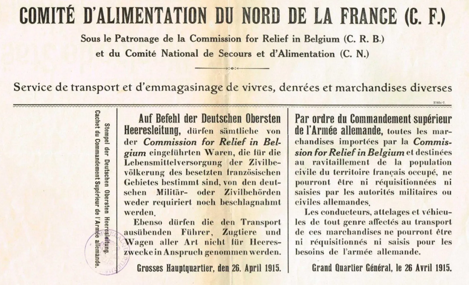 Les allemands réquisitionnent pour nourrir leurs soldats et ne veulent pas prendre en compte la population civile. Ils suggèrent au Maire de Lille de solliciter la Suisse qui a aidé des villes françaises pendant la guerre de 1870. Suite à son refus, des contacts officieux sont établis dès janvier 1915 pour que le CRB étende son action aux territoires occupés français considérés comme la onzième province belge. Cependant, les conventions entre le CRB et l’armée allemande ne seront signées qu’en avril 1915. L’armée allemande s’engage à ne réquisitionner ni les marchandises, ni les attelages qui les transportent. Le CRB reçoit de l’argent du gouvernement français de manière détournée alors qu’il affirme officiellement qu’il n’a pas à nourrir les habitants des territoires occupés.