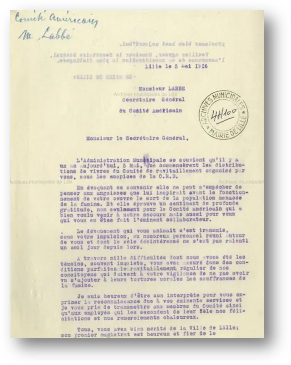 l'aide alimentaire par le Comité d'alimentation du Nord de France en mai 1916