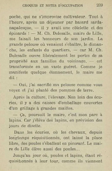 Après la culture, l’élevage. Non loin des écuries, il y a des caisses d’emballage, couvertes d’un grillage à grandes mailles. Ça, poursuit le maire, c’est mon parc à lapins. Car j’élève des lapins, en prévision des jours de disette. Dans les écuries, où les chevaux, depuis longtemps réquisitionnés, ont laissé la place libre, des poules s’ébattent en picorant. Le maire de Lille élève aussi des poules…