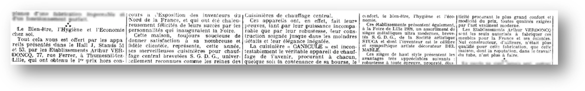 Tout cela vous est offert par les appareils présentés dans le Hall J, Stands 51 et 53, par les Etablissements Arthur VERDONCQ, 77 rue Ferrer, à Thumesnil-lez-Lille, qui ont obtenu le 1er pris hors concours à l’Exposition des inventeurs du Nord de la France, et qui ont été chaleureusement félicités de leurs succès par les personnalités qui inauguraient la Foire.