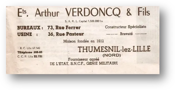 D'après les données trouvées sur Infogreffe, la société des "Ets A. Verdoncq et Fils" fut créée en 1958. C'est cette société qui avait ses bureaux au 73 rue Ferrer et ses ateliers au 36 rue Pasteur. Informations qu'on retrouve sur cette publicité des années 1960.