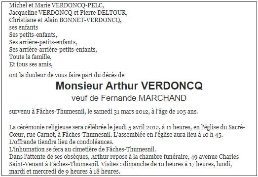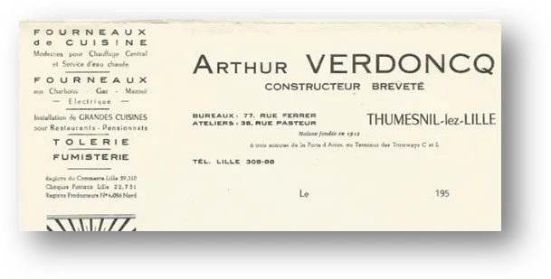 L'entreprise Arthur VERDONCQ fut fondée en 1912 par Arthur Verdoncq père d'Arthur Charles Verdoncq né en 1907 (et mort en 2012 à l'âge de 105 ans). Elle était située au 77 rue Ferrer pour les bureaux et au 38 rue Pasteur pour les ateliers. Les factures jusqu'aux années 1950 portent ces adresses.