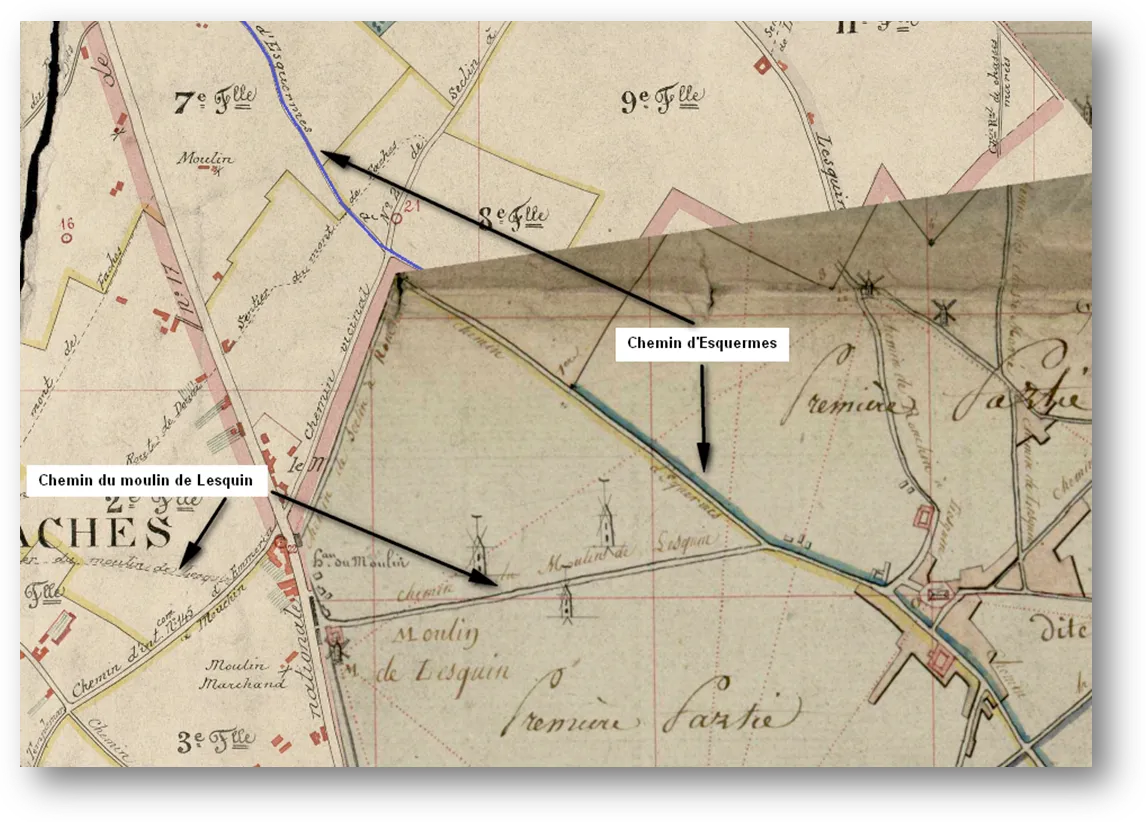 Si nous nous attardons sur la partie sur Lesquin, nous constatons que ce chemin croise le Pavé du Moulin de Lesquin et, avec ce dernier, semble emprunter le même tracé pour rejoindre l’église de Lesquin.