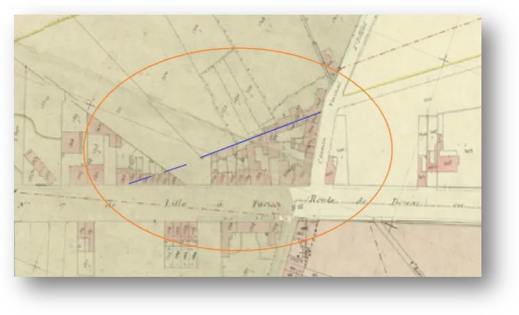 Or si on analyse attentivement le cadastre autour de la rue Charles Saint-Venant [autrefois connue sous le nom de chemin d'Haubourdin à Tournai], nous remarquons que les limites parcellaires forment une ligne semblant poursuivre le tracé du chemin d'Esquermes et aboutir en croisement avec la route nationale 17, en formant avec cette dernière un angle aigu, un angle que nous retrouvons d'ailleurs très régulièrement sur de nombreux croisements de routes du secteur, et matérialisés par les cafés et autres constructions érigés sur ce type de croisement... qu'un œil attentif peut remarquer, car souvent, le passant, arrivé à hauteur de ce type de croisement, est confronté à choisir la bifurcation qu'il lui sied le plus...