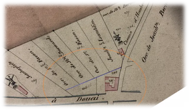 Ainsi, il s'agirait - à l'instar du bout de chemin à Faches dont je parlais précédemment - d'un tronçon de chemin qui fut neutralisé pour une certaine raison, et a fini par être englobé par les parcelles et plus ou moins effacé des cartes.