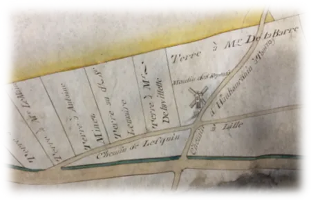 Sur cet autre extrait du plan des terres appartenant à l'Hôpital St Sauveur de Lille datant de la fin du 18° siècle [ADN 50 Fi 2623], un bond de 50 ans en arrière nous fait découvrir que le tracé cadastral de 1835 était bel et bien le reliquat de cette portion du chemin d'Esquermes, que l'on voit toujours existante en cette fin 18°... Cette portion de chemin est probablement tombée en désuétude parce que les gens du coin ne l'utilisaient guère plus, au profit de la grosse route de Douai toute (trop) proche... néanmoins, le reste du chemin a possiblement subsisté pour permettre aux cultivateurs d'accéder plus facilement sur leurs terres.