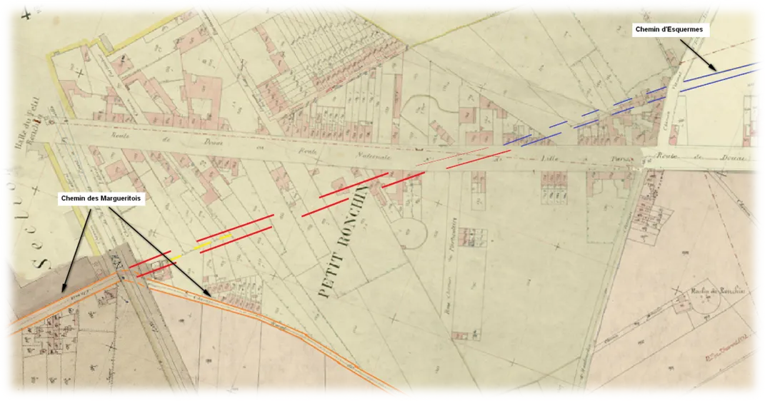 (Virage quelque peu occulté à cause du percement de la voie de chemin de fer au milieu du 19°, toujours en activité, à hauteur de l'actuel Match à Ronchin, et de l'emplacement de la feue Biscuiterie Geslot-Voreux pour vous situer).