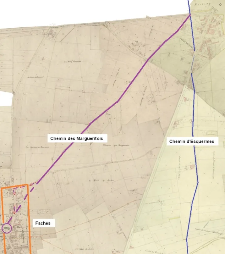 Au niveau de Faches, tous les plans anciens rencontrés s'accordent à montrer notre chemin des Margueritois relié effectivement à l'église de Faches par un axe bien droit. La fin de cet axe aurait été légèrement détourné, en raison du développement du bourg de Faches autour de l'actuelle rue Kléber, un bourg prenant en gros une remarquable forme rectangulaire... Mais sans la présence des vieilles censes et fermes flamandes édifiées depuis, on atteindrait par une ligne droite l'église de Faches avec notre chemin étudié.