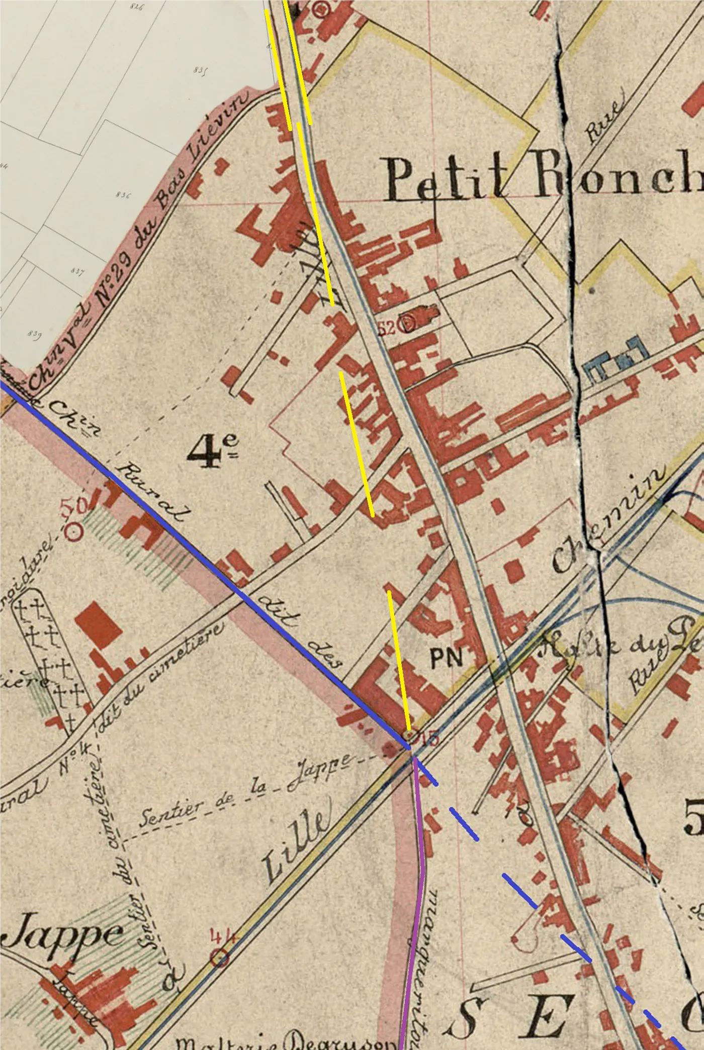 … or, grâce au plan cadastral de 1936 de Ronchin, nous remarquons que si nous poursuivons par une droite le tracé du chemin des Margueritois en venant de Faches, que notre tracé arrive… quasiment à l'endroit où la grande route de Douai forme un léger virage, une petite courbure bien étrange pour une grande route de communication alors que les 3 km derrière et les 3 km suivant ce virage sont bien rectilignes.